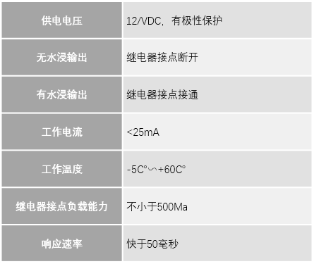 接觸式水浸傳感器可提供一個(gè)繼電器接點(diǎn)輸出,選用12V或24V供電的水浸傳感器,輸出為干接點(diǎn),采用液體導(dǎo)電原理進(jìn)行檢測(cè),當(dāng)水浸高度(約距離放置傳感器的表面1mm)接觸到傳感器探針時(shí),將浸水狀態(tài)轉(zhuǎn)換為繼電器干接點(diǎn)輸出。傳感器中的繼電器導(dǎo)通,連通外部報(bào)警回路。