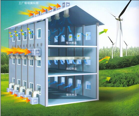 工人工位不固定;注重環境的整體降溫;熱源可得到控制或受到限制;廠房面積相對較小。如在一些特定的區域需集中降溫可增加定點降溫,形成"整體-定點"降溫模式